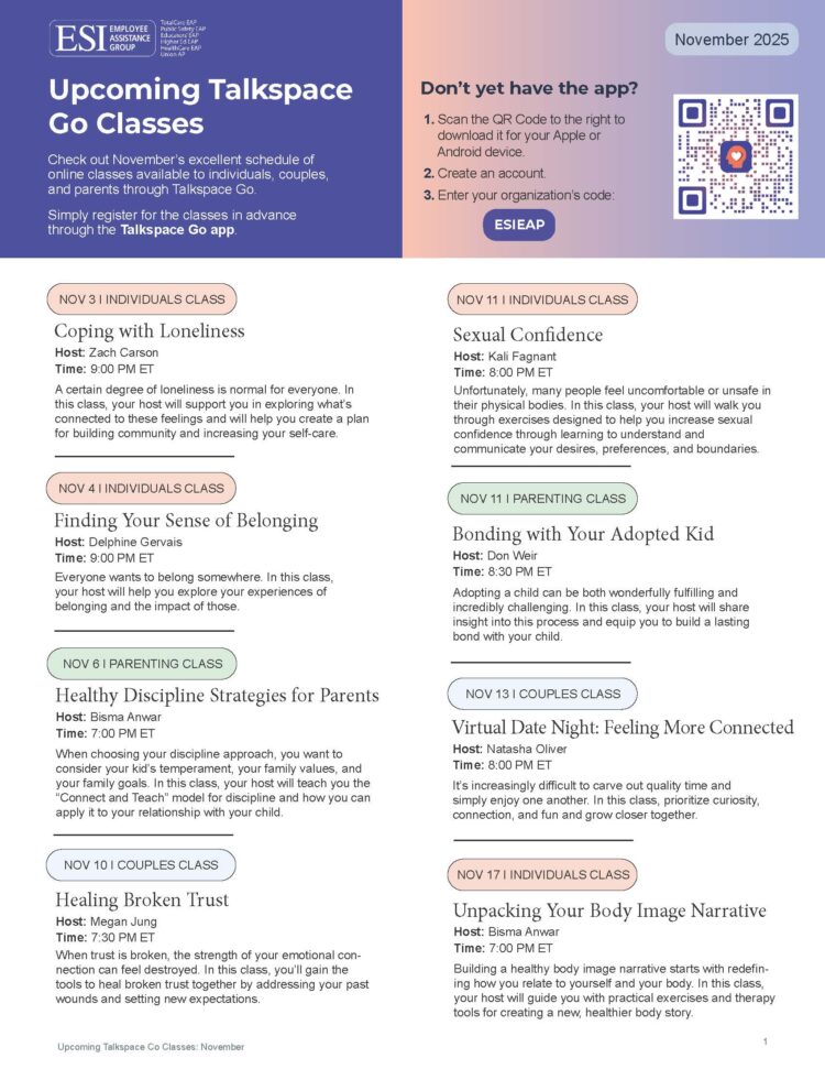 Check out this month’s topics designed to improve your mental health and wellbeing! These live, online group classes are therapist-led, anonymous and free.