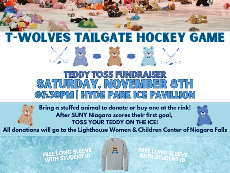 Bring a stuffed animal to toss after SUNY Niagaraβs first goal! Students get a free long-sleeve shirt with ID, employees/family can purchase one. All proceeds benefit the Lighthouse Women & Children Center.