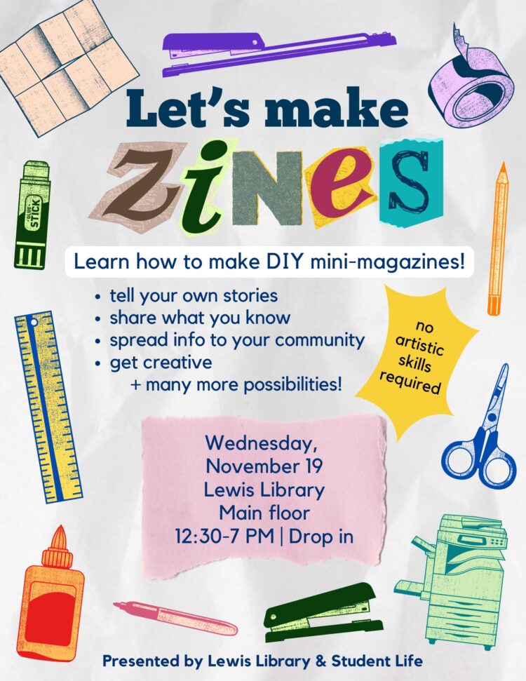 Join us in the Lewis Library for a walk-in workshop on how to make zines! Drop in anytime between 12:30pm and 7pm on Wednesday, 11/19.