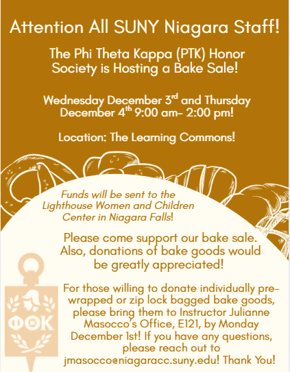 Please stop by our PTK bake sale on December 3rd and 4th from 9:00am – 2:00pm in support of the Lighthouse Women and Children Center in Niagara Falls!