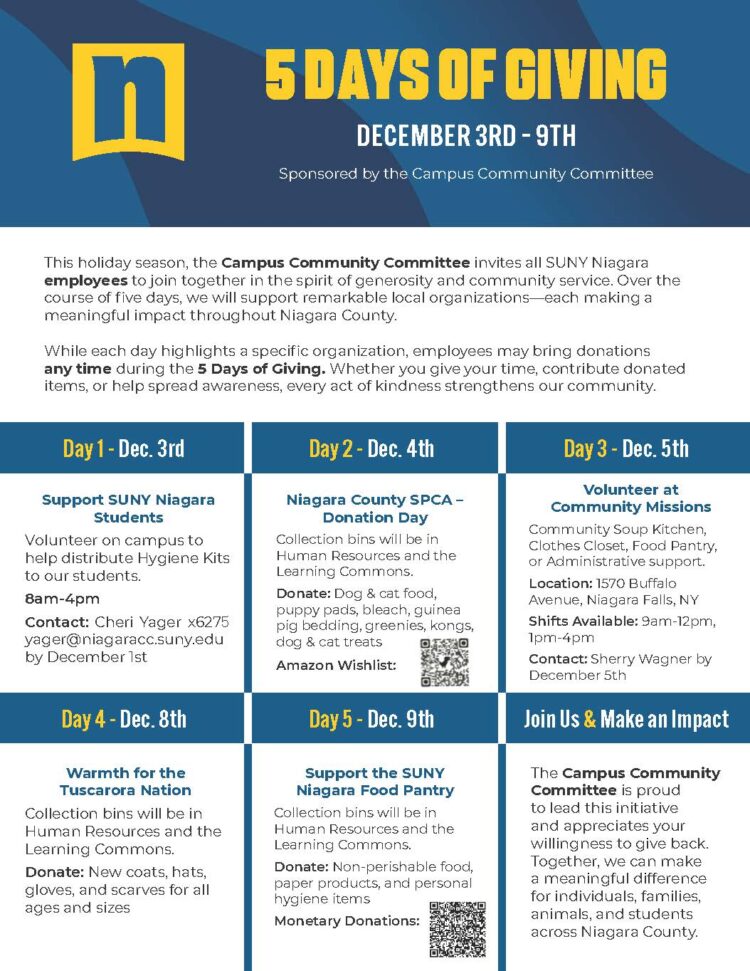 This holiday season, the Campus Community Committee invites all SUNY Niagara employees to join together in the spirit of generosity and community service. Over the course of five days, we will support remarkable local organizations—each making a meaningful impact throughout Niagara County.
