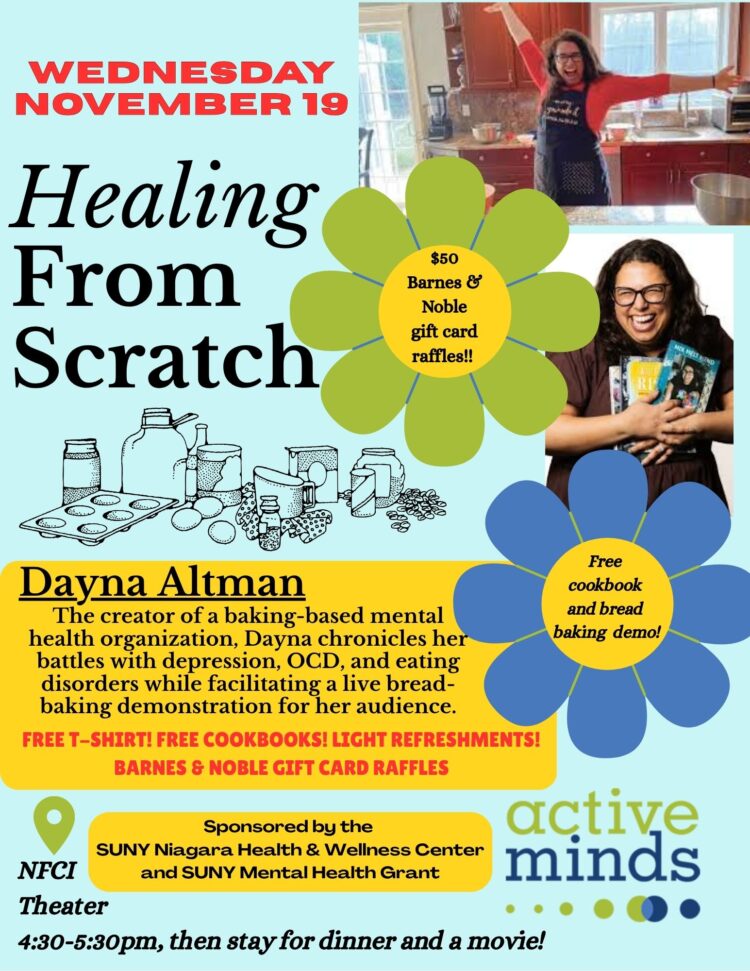 Join the SUNY Niagara Health & Wellness Center and Active Minds for their presentation of Healing From Scratch! Dayna Altman, the full force and sole operator of Bake it Till You Make It LLC, harvests her passion for mental health advocacy by using food and baking to create an authentic recipe for vulnerable storytelling. Dayna chronicles her battles with depression, OCD, and eating disorders while facilitating a live bread-baking demonstration. This event is sponsored by the SUNY Mental Health Grant. Wednesday, November 19th at 4:30pm in the NFCI theater. Free t-shirt! Free cookbook! Barnes & Noble gift card raffle!