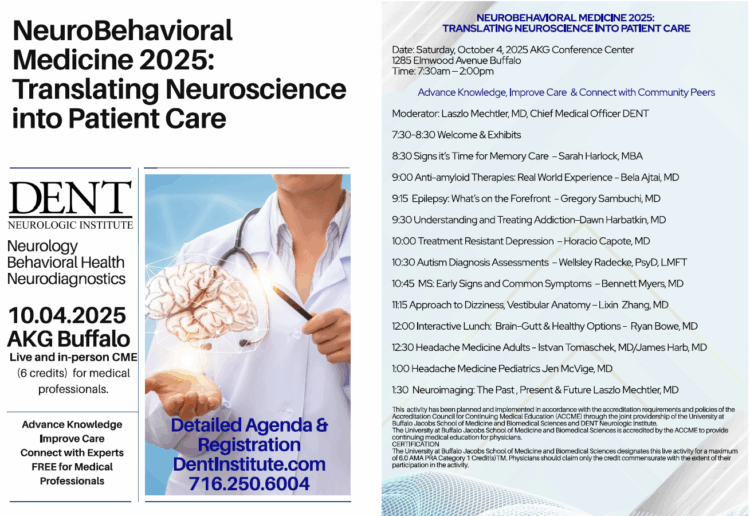 Hosted by the DENT Neurologic Institute, this live, in-person event is free for medical professionals and offers 6 CME credits. The program includes sessions on memory care, addiction treatment, treatment-resistant depression, autism diagnosis, MS, vestibular disorders, headache medicine, and neuroimaging.