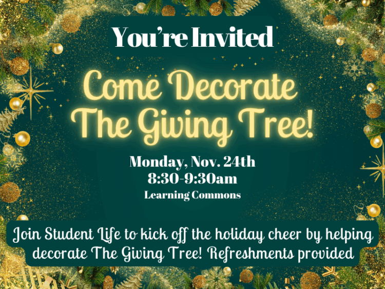 Join us on Monday, November 24th to help Student Life spread holiday cheer as we decorate The Giving Tree in the Learning Commons!