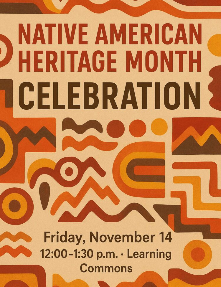 In celebration of Native American Heritage Month, the Native American Student Club invites you to join us for a Native American Heritage Social on Friday, November 14th, from 12:00–1:30 p.m. in the Learning Commons.