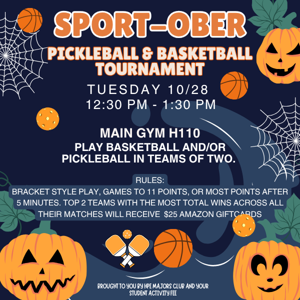 HPE club is hosting a basketball and pickleball tournament for teams of two on Wednesday, October 28th in the main gym. Help us spread the word to your students!