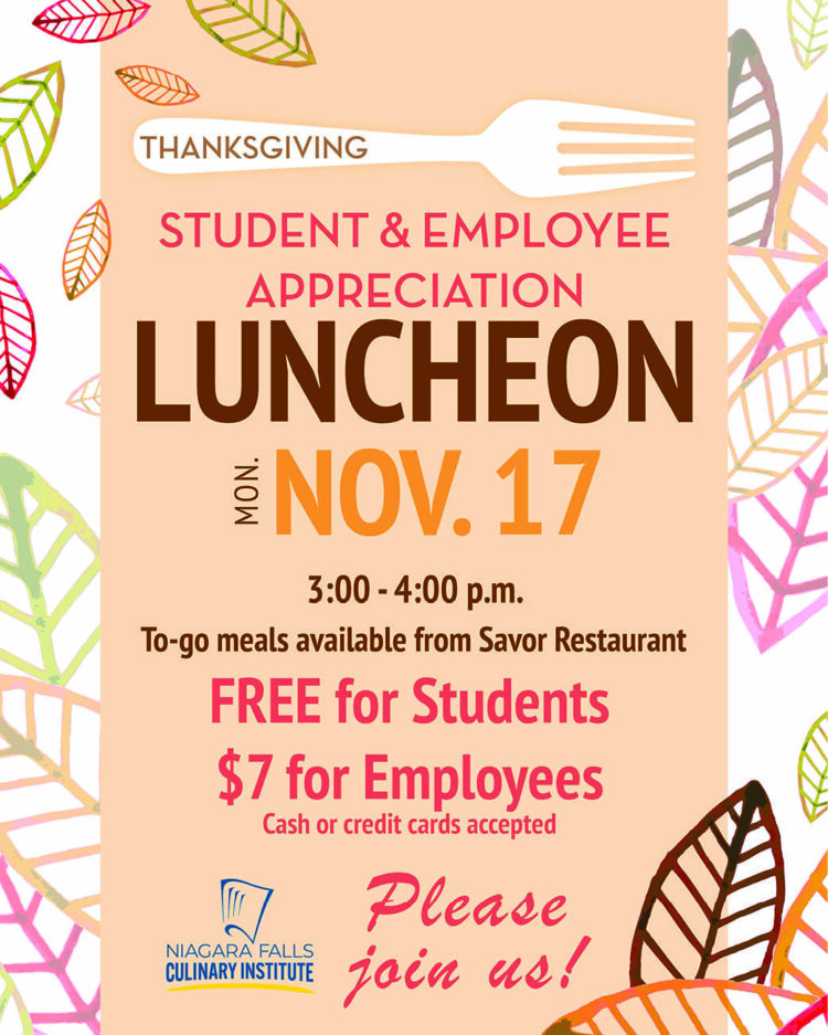 On Monday, November 17th we will be having the NFCI Student & Employee Appreciation Luncheon. Thanksgiving To-go meals will be available at Savor from 3:00-4:00pm. It’s FREE for Students and $7 for Employees. We hope you will join us!