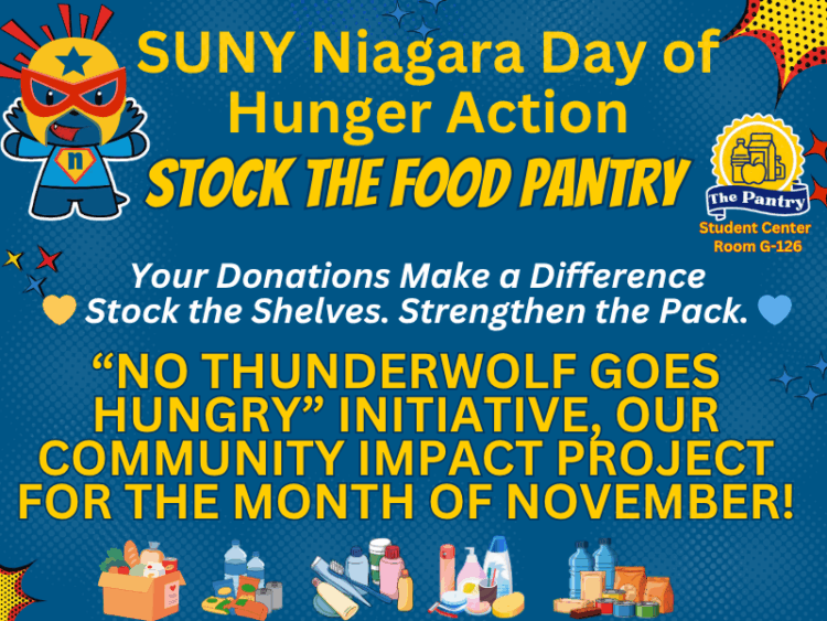 SUNY Niagara proudly joins campuses across New York State to shine a spotlight on food insecurity as part of the statewide SUNY Day of Hunger Action. This year, we’re kicking off a month-long campus effort, the “No Thunderwolf Goes Hungry” initiative, our Community Impact Project for November.